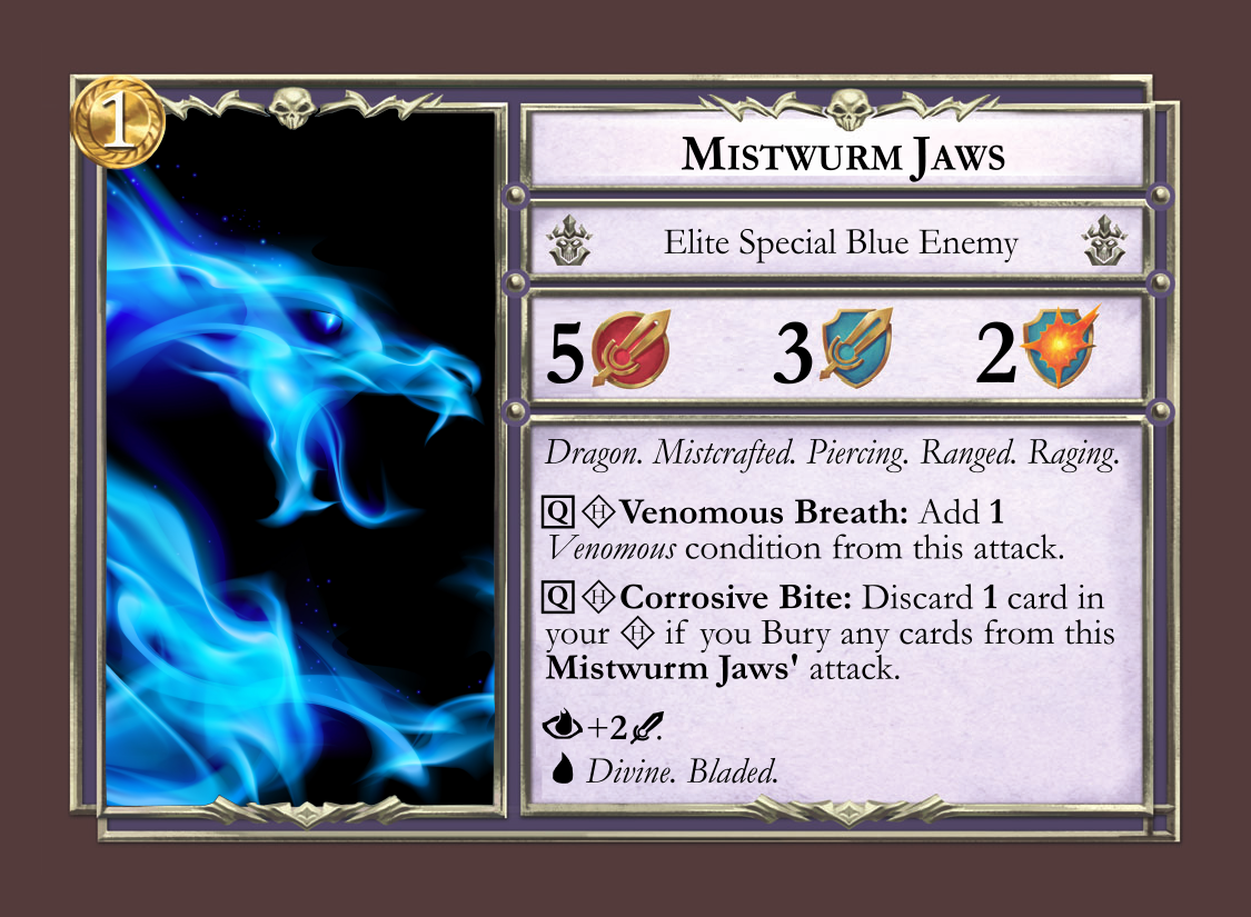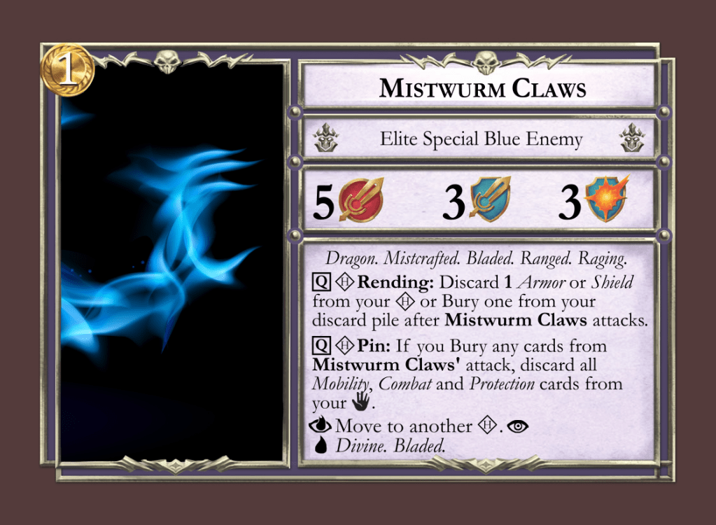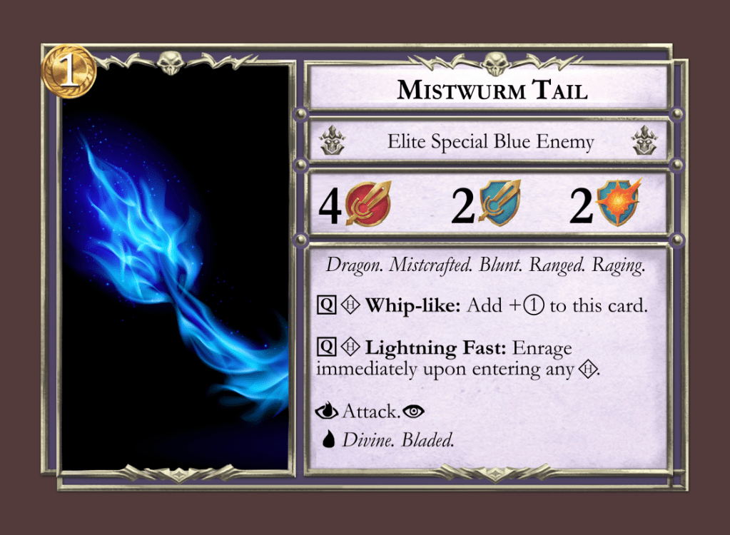 But in my opinion his most exciting feat is his Mistwurm campaign. It is comprised of four linked quests that make up a robust, epic campaign to take your Mistfall heroes through. He stretches the limits on the game’s mechanics, and introduces brand new enemies, allies and villains to face. I wanted the community (including myself) to have access to designed versions of these new cards, so I created a posted a file.