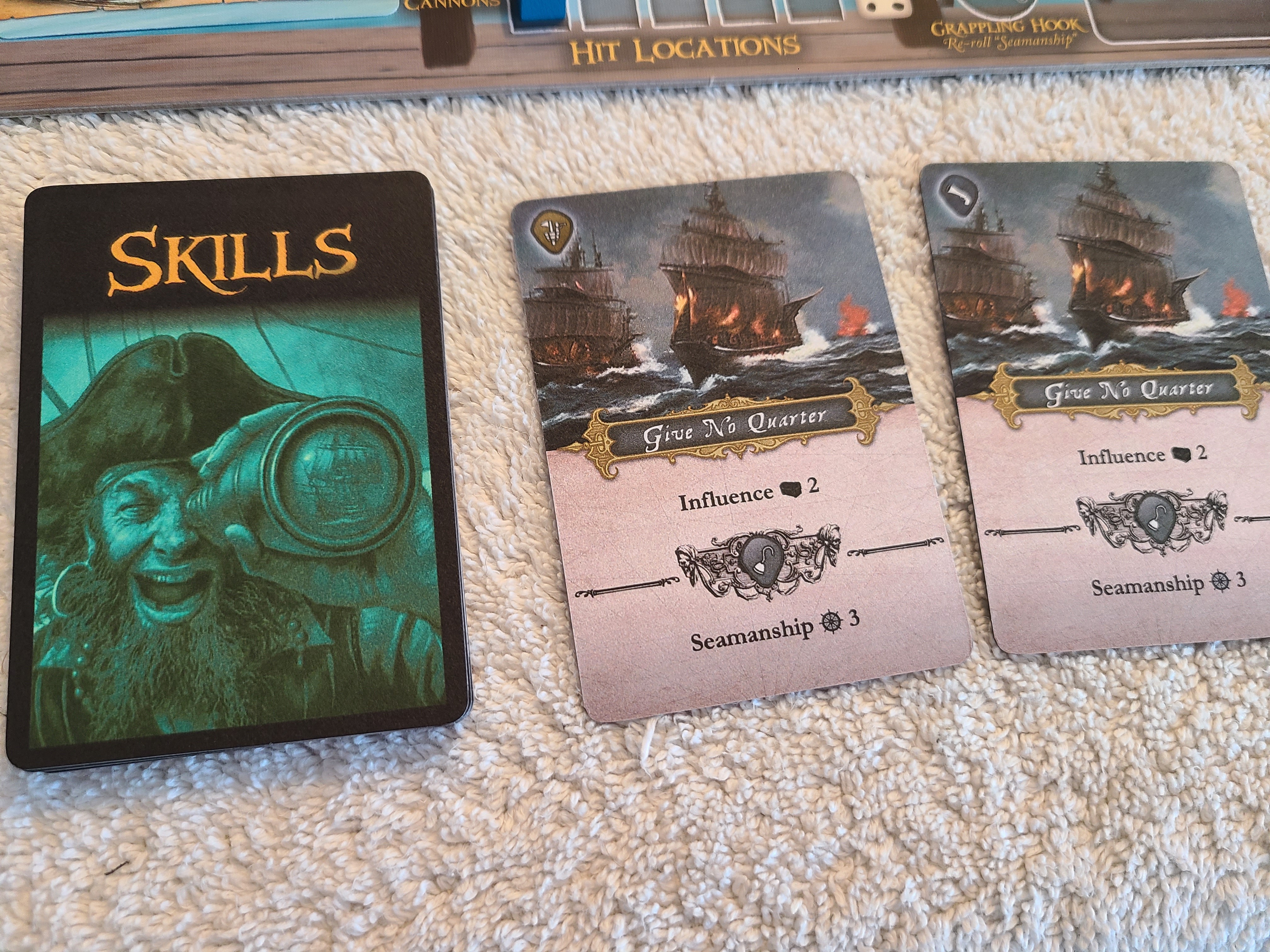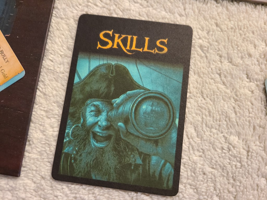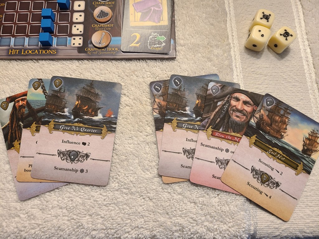 To make your captain’s skill stats relevant, I came up with this mechanic: You have a default hand size of 4. Right before you engage with a skill check, you draw additional cards based on your captain’s stat for that skill. E.g., if your captain has a 3 seamanship stat, you will have a hand size of 7 when facing seamanship tests.